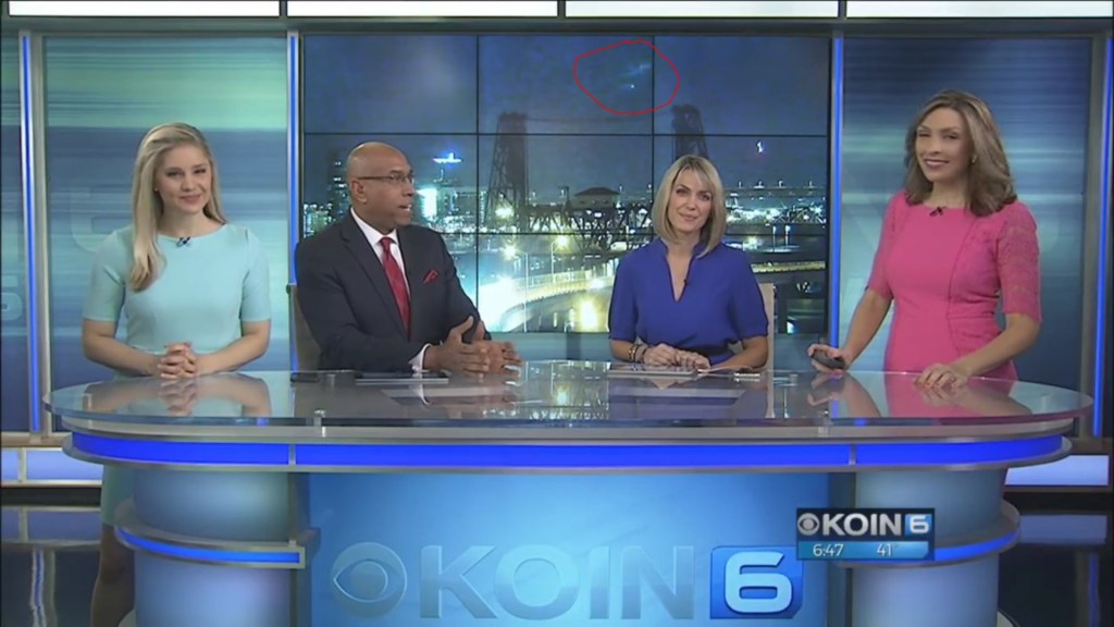 MYSTIKK – Oppmerkende seere som så på en morgensending i Oregon var forvirret over å se hva det som synes å være to ufoer som dukket opp bak nyhetsankerene.