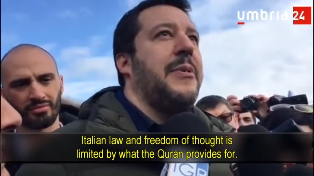 Lederen for Lega Nord Matteo Salvini, sier i et intervju at Islam ikke er en religion, men er en lov og som en lov er Islam ikke kompatibelt med det Italienske samfunnet.