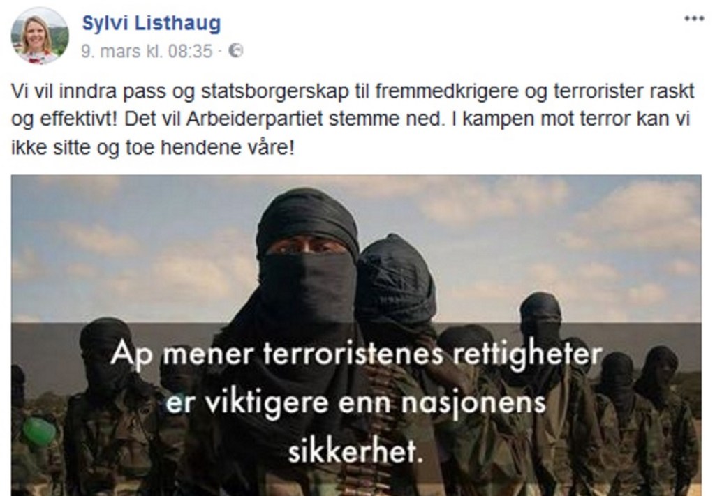 AP anklager Sylvi Listhaug for å såre følelsene til Utøya overlevende når hun har postet et bilde på facebook hvor hun skriver at arbeiderpartiet mener hensynet til terroristers rettigheter får foran nasjonalsikkerhet, og viser i innlegget til at AP er motstandere av å frata terrorister med dobbelt statsborgerskap dems norske statsborgerskap.