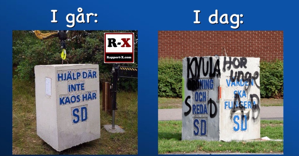 På onsdag trodde Sverigedemokraterna at de hadde løst problemet med stjålne eller raserte valgkampplakater. Tre tonn tunge betongblokker med partiets budskap ble plassert på et titalls steder i Halmstad.