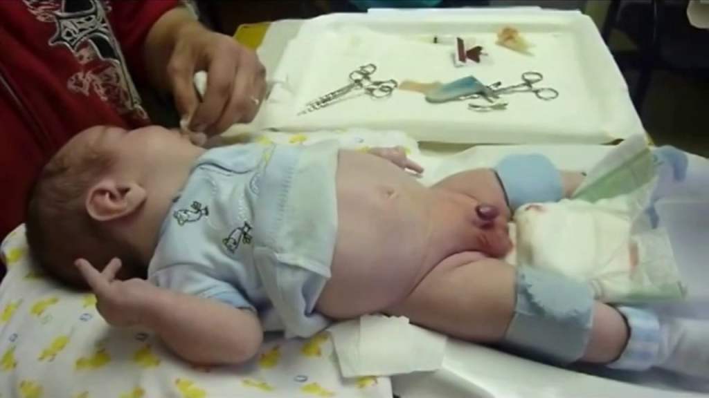 Du tar en liten babygutt og spenner han fast i et apparat som holder beina hans fra hverandre. Det er borrelås-håndhjern for å holde armene og beina på plass så han ikke klarer å bevege seg under inngrepet. Penisen hans blir dyppet i antiseptisk. Den fjerner ingen smerte, skal bare hindre bakterier å gro etter inngrepet.
