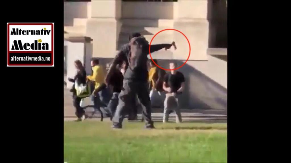 På videoen vises en mann med afrikansk utseende som vifter med en øks og oppfører seg truende mot forbipasserende. Minst tre politifolk sikter på han med pistoler og får til slutt kontroll og arresterer mannen.