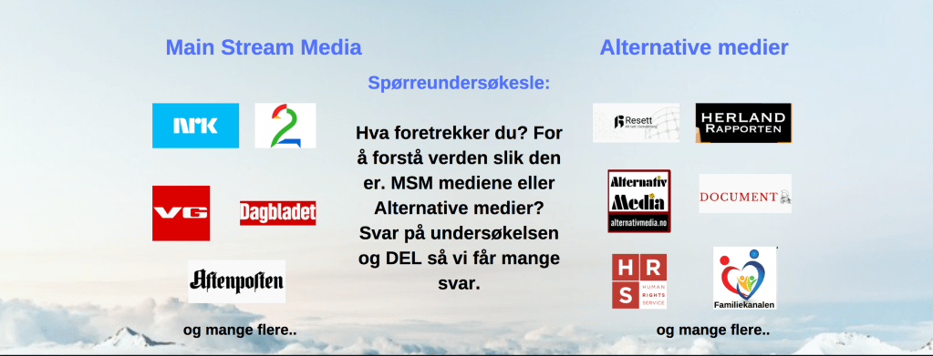 Hva foretrekker du? For å forstå verden slik den er. MSM mediene eller Alternative medier? Svar på undersøkelsen og DEL gjerne så vi får mange kommentarer og svar. Det gjør du her: