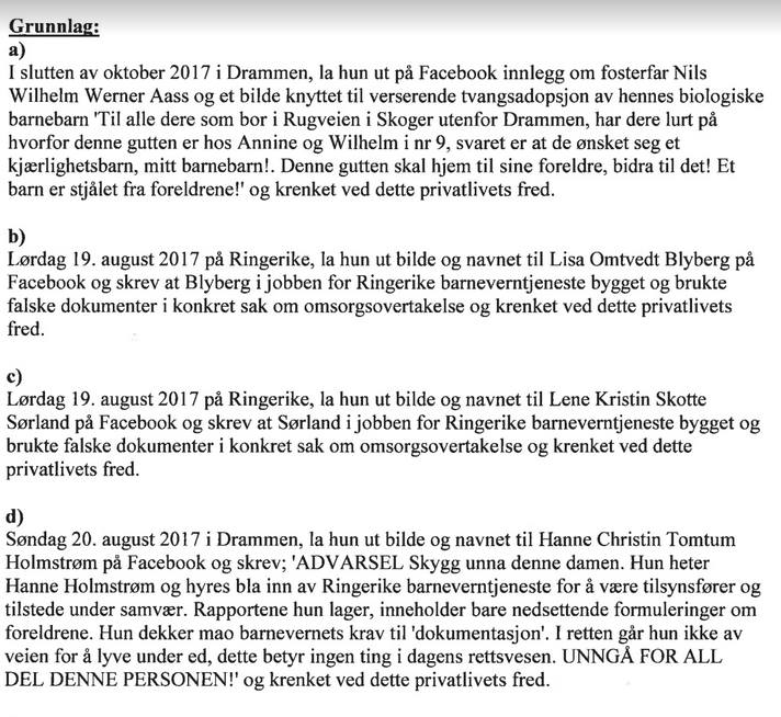 I dommen er det listet opp over flere sider hva Ruth Ensby har skrevet på Facebook om fosterforeldrene og saksbehandleren i barnevernet. Med anklager om at det har vært svært belastende for de fornærmede å få navnet sitt eksponert med negativ omtale i full offentlighet. Dommen er ikke anonymisert og det er ingen begrensninger i offentlig gjengivelse. Alle omtales med fullt navn sammen med Ruth Ensbys meninger om den enkelte sitert. Dommen levner ingen tvil om hvem som er fosterforeldre/saksbehandler, og hvor grusomme de er. Ringerike krenker i så måte de fornærmede langt mer i dommen enn hva de eventuelt måtte være av Ruth Ensbys ytringer.