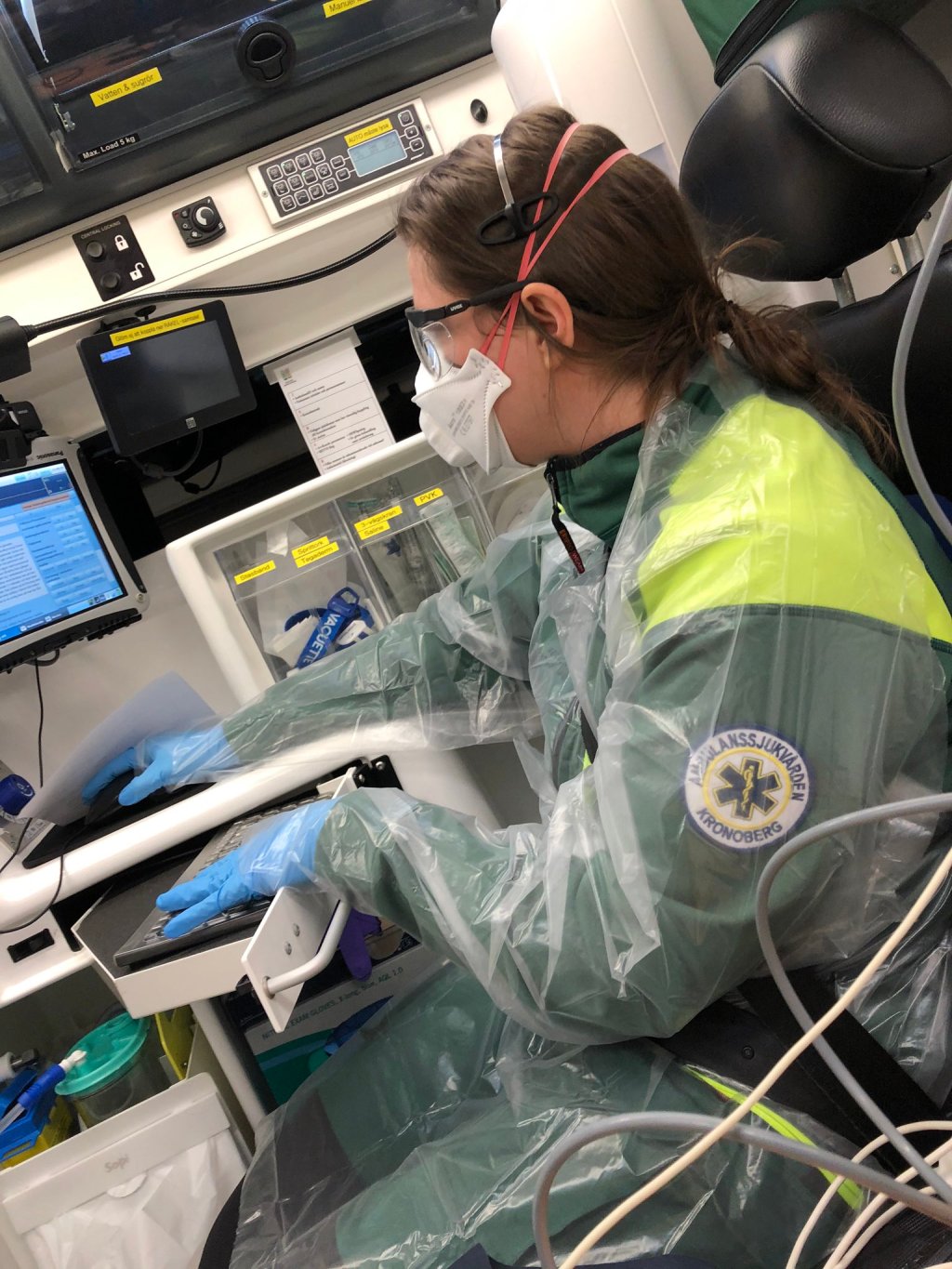 Jag blev hämtad med ambulans för att jag fick så svårt med andningen. Ambulanspersonalen var fantastiskt duktiga. På sjukhuset fick jag andsas syrgas och luftrörsvidgande. Kändes konstigt att att hamna i ett inlåst rum med en läkare som hade plasttäcke på sig och en ansiktsmask som likande en svetshjälm. De tog blodprover på mig och när provsvaren kom tillbaka så visade sig mina värden vara så bra att jag kunde skrivas ut från det låsta rummet.