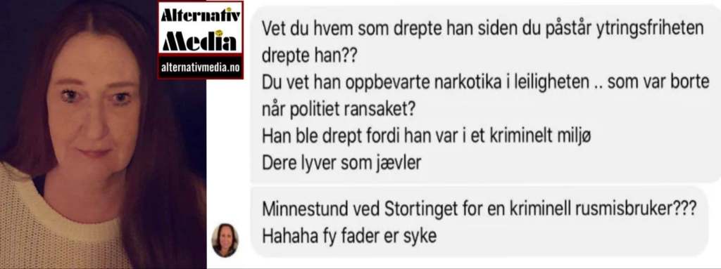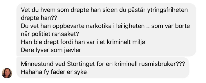 » Han ble drept fordi han var i et kriminelt miljø. Dere lyver som jævler», og «Minnestund Stortinget for en kriminell rusmisbruker??? Hahaha fy fader er syke».