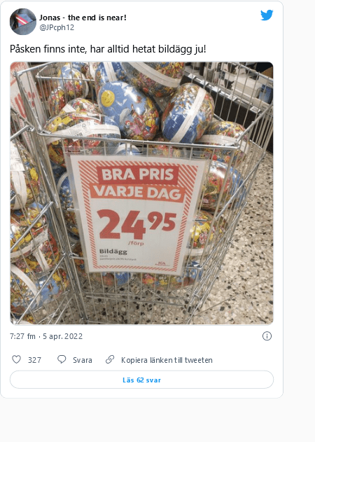Vi har i den senere tid opplevd som eksempler at globalistkonsernet IKEA har vraket fenomenet jul til fordel for det mer – i deres øyne – tidsriktige «vinterfest«, og den tradisjonelle juledrikken julemust, har i angsten for å provosere enkelte befolkningsgrupper i det nye Sverige, måtte vike for «festdryck«. Nå kan Samnytt melde at det er de nordiske barns store spenningsmoment i etterlengtede vårtider, påskeegget, som ikke finnes verdig til å eksistere i det nye og tolerante svenske paradiset, hvor angivelig alle kulturer og tradisjoner må aksepteres.