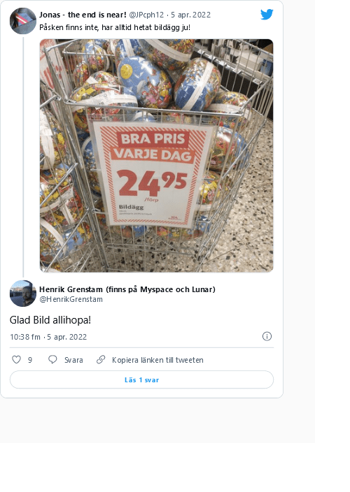 En Twitter-bruker skrev sarkastisk «Synd at bildefredag (langfredag) er så kjedelig. Flaks at man har bildeegget (påskeegget) i tilfelle det går en bildefilm (påskefilm) på TV i løpet av bildet (påsken).