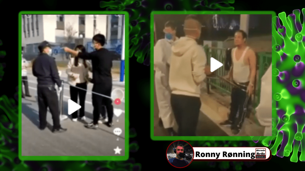 Denne kinerseren blir behandlet som en mannevond hund hvor autoriteter benytter et slags greip for å holde han i sjakk mens han angivelig leter fram sitt koronapass eller lignende. Vi ser tydelig at han reagerer med sinne og synes hele situasjonen er urimelig.