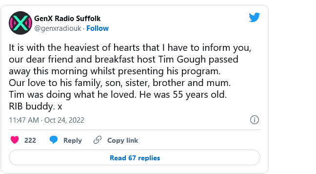 » Det er med stor sorg at jeg må informere om at våre nære venn og programlederen Tim Gough døde i morres mens han ledet sitt program», skrev GenX på Twitter.