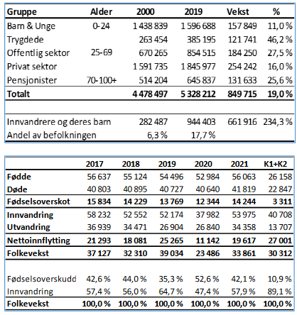 Den neste tabellen viser endringer i befolkningen fra og med 2017 til og med KV-2 2022. Det er her verd å merke seg at fødselsoverskuddet første halvår 2022 falt med 52,6%, sammenliknet med gjennomsnittet for første halvår for de 5 foregående år. I første halvår 2022 stod innvandring for 89,1% av befolkningsveksten. Dette har aldri før skjedd i årene jeg har data for.