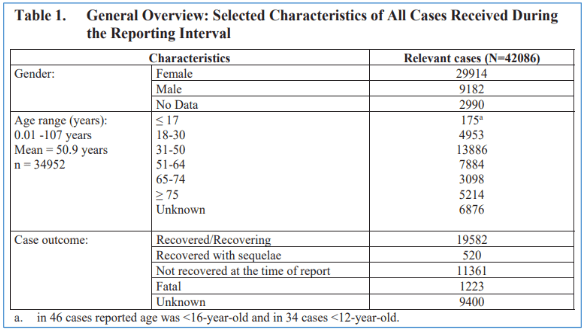 Jeg nevner dette for å understreke at blant personene Pfizer-rapporten omhandler, hadde et stort flertall kun mottatt 1 dose. Et annet forhold er at man ikke ble regnet som vaksinert før 2 uker etter vaksinering, som er den perioden risikoen for å dø av vaksinen, da var størst. Et tredje forhold er underrapportering. Ingen vet hvor store disse tallene er i dag, men Lazarus-Report fra 2011 fant at under 1% av alle bivirkninger, skader og dødsfall etter vaksinasjon ble rapportert. Tallet er nok høyere i dag, men var neppe vesentlig høyere i begynnelsen av 2021. 42,086 rapporter er følgelig kun et utvalg, kanskje bare 5%, av hva som virkelig skjedde de første 10 ukene av vaksineringskampanjen.