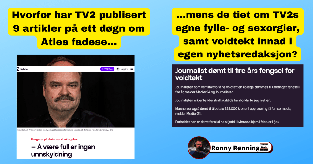 Kun noen og tyve timer etter at Sumaya Jirde Ali offentliggjorde Atle Antonsens ufine oppførsel mot henne på en bar i Oslo, har det venstreorienterte nettstedet TV2 rukket å publisere minst ni artikler om saken. Dette står i sterkt kontrast til deres fortielse av TV2 Nyhetsredaksjons sak tidligere i høst, hvor det ble etter en voldtektsdom ble avslørt en umoralsk bedriftskultur med mye utagerende fyll og umoralsk forhold til lettsluppen sex.