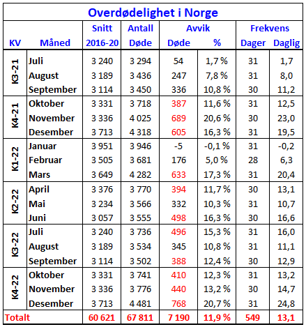 I Desember 2022 døde 768 flere enn forventet, et tall som er forventet å stige noe, altså dobbelt så høyt som for HELE 2012. Dette er 2301% høyere enn månedssnittet for 2012. Overdødeligheten i desember var på 20,7%. Hver eneste dag i desember døde 24,8 flere personer i Norge enn desember-snittet for perioden 2016-2020.