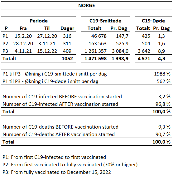 Tall fra FHI kan videre fortelle at mellom 1/7-2022 og 15/12-2022 døde 5% av samtlige som i denne perioden ble smittet av Covid-19. Det er 50 ganger høyere dødelighet enn hva som globalt var tilfelle for Covid-19 FØR mRNA-vaksineringen startet. I Norge har 96,8% av alle C19-smittede og 90,7% av alle C19-døde skjedd ETTER at vaksineringen startet.