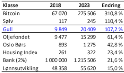 Hvis gull brukes som målestokk for kjøpekraft, så er det klart at det aller meste som er nominert i NOK, har tapt kjøpekraft de siste 5 årene. Selv oljefondet har tapt betydelig kjøpekraft i denne perioden, og ser vi på