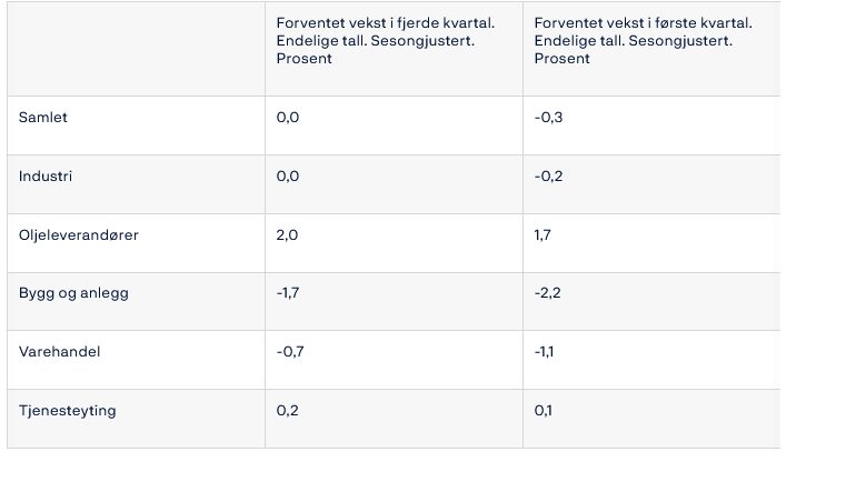 I tabbellen ovenfor vises en samlet uendret vekst for fjerde kvartal, og en svak forventet nedgang på -0,3% for første kvartal 2024. For oljeleverandører er veksten størst med 2,0% i fjerde kvartal i år og 1,7% første kvartal 2024. Bygg og annlegg har mest nedgang med -1,7% i fjerde kvartal og -2,2% første kvartal.