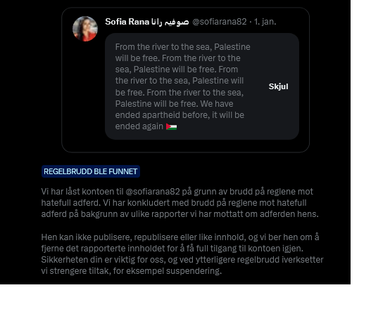 Alternativ Media fikk i ettermiddag tips med vedlagt skjermbilde som sier at Rødt-politiker og rådgiver for Antirasistisk Senter, Sofia Rana, har fått X-kontoen sin låst av etter ytringer som X-eier Elon Musk definerer som oppfordring til folkemord mot jøder.