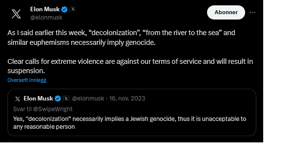 Dette tolkes dit hen at Musk ser på begreper som «dekolonialisering» og «From the river to the sea, Palestina wil be free», som formildende ytrykk for noe som er verre, i dette tilfellet folkemord mot jøder. Og at dette vil føre til utestengelse.